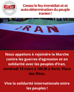 Nous appelons à rejoindre la Marche contre les guerres d’agression et en solidarité avec les peuples d’Iran, vendredi 13 mars à 18h30 à Paris, Place des fêtes.