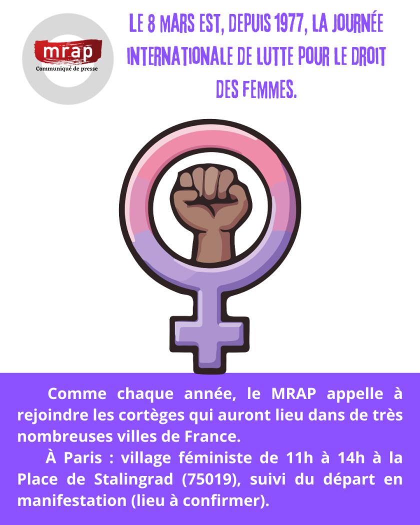 Cette année encore, en France, le 8 mars, c’est lutter contre les inégalités, les discriminations dont souffrent les femmes (carrière plus lente, salaires plus faibles, emploi sous-qualifié...). L’accès à l’IVG, théoriquement garanti, ne l’est pas du fait des sous-équipements, de la fermeture de nombreux centres d’orthogénie, et la "clause de conscience" qui permet aux médecins de ne pas pratiquer cet acte. Avec le Collège national des gynécologues et obstétriciens (qui s’est prononcé à l’unanimité) le MRAP appelle à la suppression de cette clause de conscience.